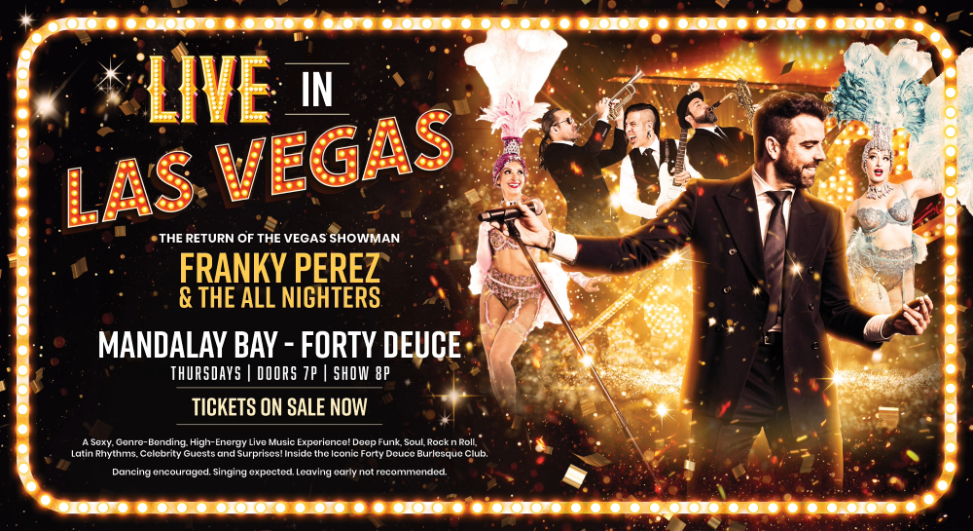Singer, songwriter, and Las Vegas headliner FRANKY PEREZ—acclaimed for his powerhouse voice, magnetic stage presence, and genre-blending artistry—and his dynamic band The All Nighters are performing a weekly residency at Ivan Kane’s legendary Forty Deuce inside Mandalay Bay Resort and Casino. Every Wednesday night at the newly rebooted burlesque club, the show starts at 8pm (doors at 7pm). The residency is presented by Wild Turkey Bourbon. Tickets are available at www.fxptheartist.com. There’s free parking for the first three hours for locals (with Nevada ID).