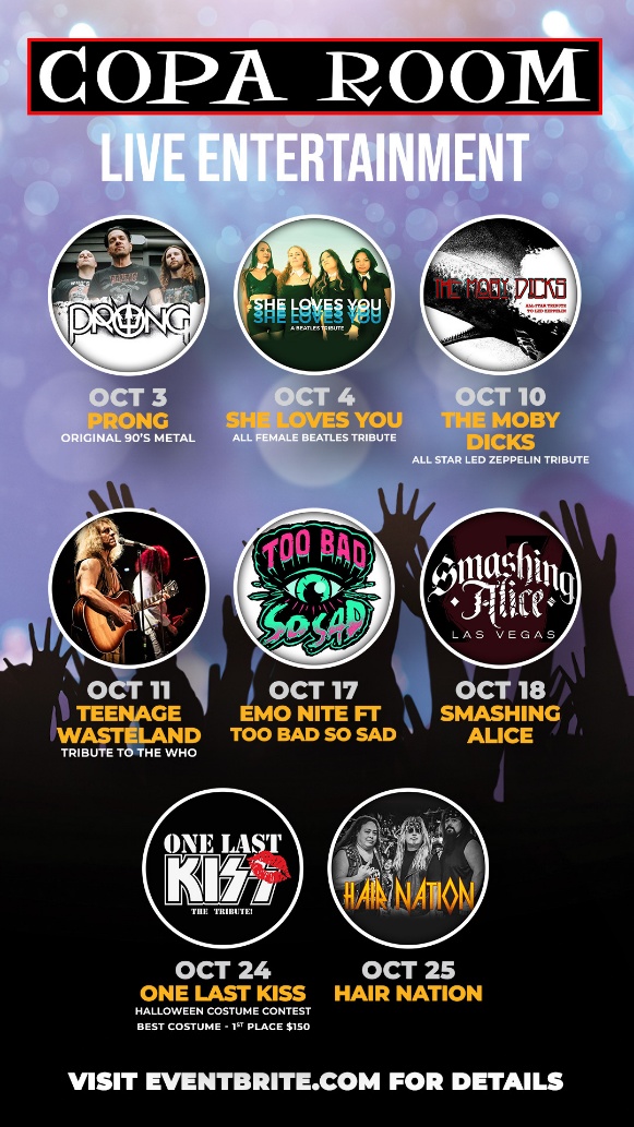 Rock is thriving at the COPA ROOM inside Tuscany Suites & Casino in Las Vegas. Known as the city’s newest rock n’ roll live destination, the intimate room with a big sound has shared its stacked lineup of weekend shows throughout October and November 1.See the schedule of events below.