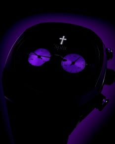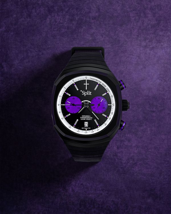 “The Ozzy” is based on Split’s MC collection that features a revolutionary Seiko family automatic chronograph. Using the most advanced modern materials, the watch is intentionally designed to be unpolished and stripped back. “The Ozzy” features the rock legend’s iconic purple tinted glasses on the sub dials and his cross at 12 o’clock. Each piece is meticulously hand painted and Ozzy’s logo can be seen on the rotor through Split’s exhibition case back.